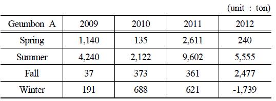 미천A 유역은 봄 357ton, 여름 142ton, 가을 614ton, 겨울 289ton이고, 금본A 유역은 봄 240ton, 여름 5,555ton,