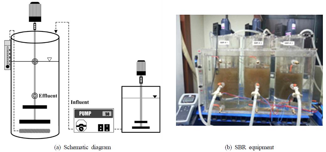 SBR 반응기 체적은 10 L (Diameter 0.2 m × Height 0.32 m)로 구성하였으며, 완전혼합이 가능한 교반기와 산기장치로 이루어져