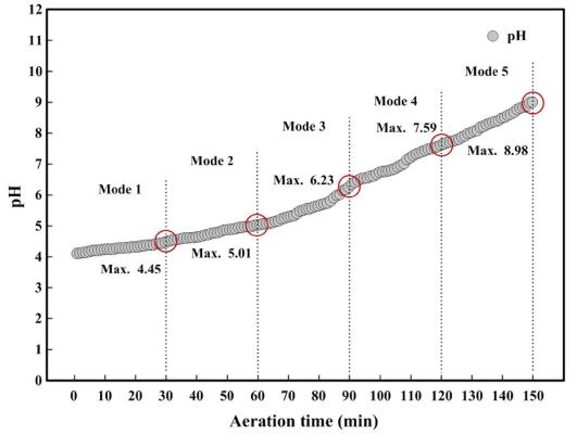 증가하였다. 이후 60분이 경과한 후 pH는 5.01, 90분에서 6.23, 120분 후 7.59, 150분 후 8.98까지 증가하는 것으로 나타났다.