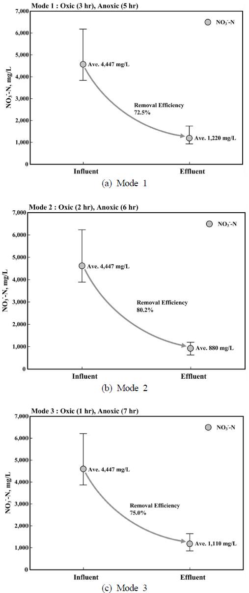 SBR 운전주기별 질산성 질소의 제거특성을 평가한 결과 Mode 1에서 방류수의 NO3--N 농도는 평균 1,220 mg/L로 약 72.5%의 제거효율을 보였다. Mode 2의 경우 방류수 평균 NO3--N 농도는 880 mg/L, Mode 3에서는 평균 1,110 mg/L를 나타내었다. 제거효율은 각각 80.2%, 75.0%를 나타냈다. 질소 제거효율