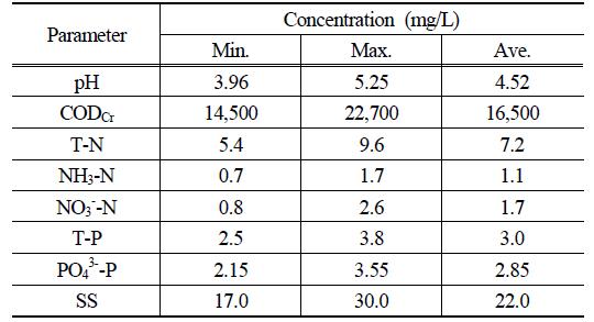낮은 pH 특성을 보이는 것으로 나타났다. 또한 주정폐수의 평균 CODCr 농도는 16,500 mg/L, T-N 7.2 mg/L, T-P 3.0 mg/L, SS 22 mg/L로 분석되었다.