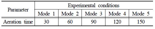 한다. 포기를 해주었을 경우 용존산소 농도는 2.0~3.0 mg/L로 유지하였으며, 실험조건을 아래 Table 2에 나타내었다.