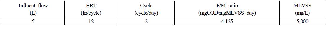 hr/cycle로 하루에 2 cycle 운전되도록 구성하였다. F/M ratio는 4.125 mg COD/mg MLVSS·day, MLVSS 5,000