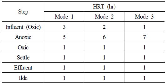 SBR 운전 시작 시 원수유입과 동시에 포기를 실시하였으며, 포기 단계를 각 Mode별로 3, 2, 1 hr로 설정하였다. 또한 무산소 운전주기는
