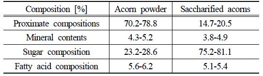 saccharified with glucoamylase (150 U/g dry acorn) for 4h at pH 4.0 and 60℃ (Tang et al., 2011). Acorn powder was treated as above for the liquefaction step; however, the saccharification