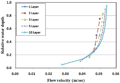 그리고 0.052 m/sec로 계산되어 수층의 수가 증가함에 따라 입자의 이송속도가 빨라지는 것으로 나타났다. Fig. 6은 수층의 수에 따른 연직 유속분포로서, 수층의 수가 증가함에 따라 표층 유속이 증가하는 경향을 나타내고 있다. 수층의 수가 증가하면 각 수층의 두께가