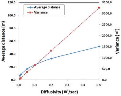 0.005 ∼ 0.5 m2/sec범위에서 단계적으로 증가시켜 입자 확산에 대한 민감도분석 결과, 수평확산계수가 증가함에 따라 각 입자의 평균거리는 대수적로 증가하지만, 입자들의
