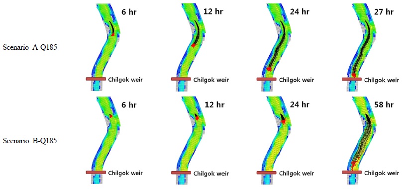 칠곡보 상류 3.0 km 지점에서 유류오염사고가 발생한 것으로 가정하고, 평수량 조건에서 유류오염물질 입자의 거동을 모델링한 결과를 Fig. 10에 제시하였다. 이때 수평확산계수는 GPS 부자 실험결과로부터 산출한 값인 0.096 m2/sec를 적용하였다. 시나리오 A-Q185의 경우에는 입자가 약 27시간 후에 칠곡보를 통과하여 강정고령보 상류로 유입되며, 시나리오 B-Q185의