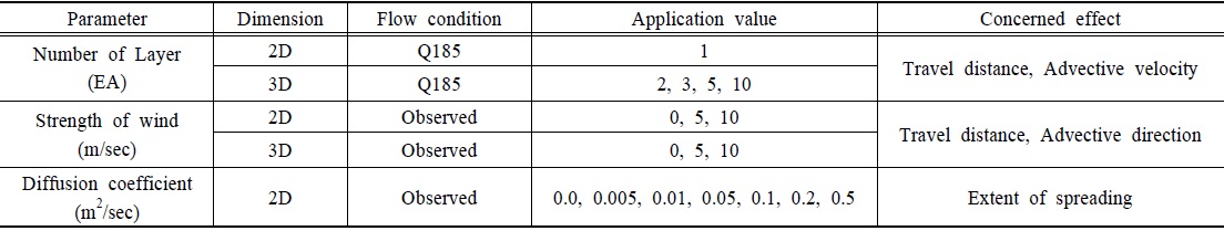 바람의 세기, 수평확산계수를 선정하고, Table 1과 같이 모형의 구동조건을 변경시키면서 유류입자의 도달거리, 이송속도, 이송방향, 확산범위 등에 대한 영향을 분석하였다.
