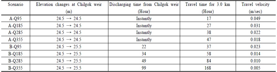 유류오염 사고는 칠곡보 상류 3.0 km 지점에서 발생한 것으로 가정하고, Table 2와 같이 구미보와 감천 및 한천으로부터의 유입유량 변동과 칠곡보의 수위 조절에 따른 시나리오를 구성하였다. 시나리오 A 그룹은 4가지 유황조건(Q95,