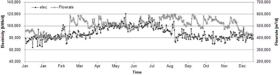 Annual trends of energy consumption and flowrate of target wastewater plant.