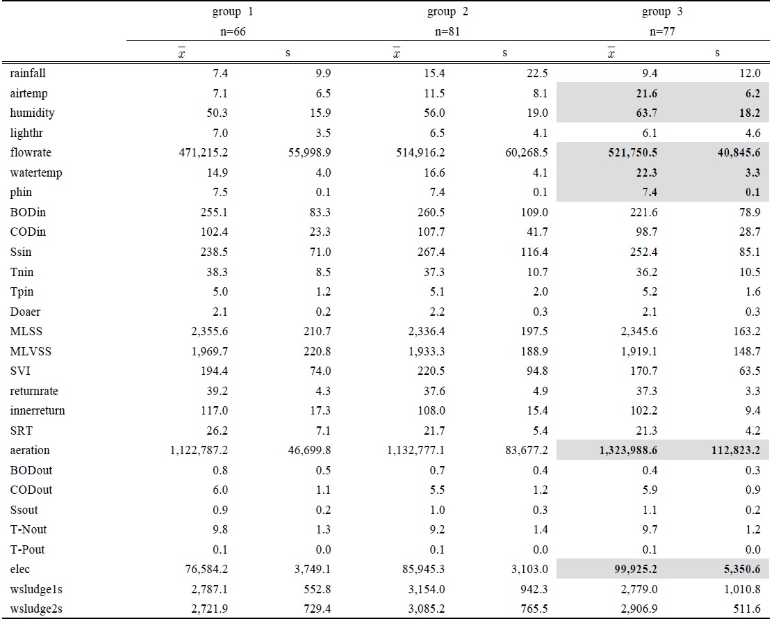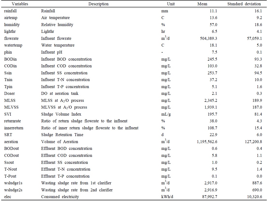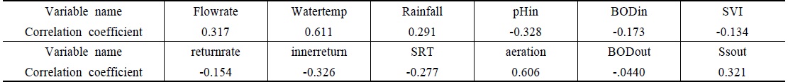 유입유량, 수온, 유입수 pH와 폭기량임을 확인하였다. 기온과 상대습도는 유입수 유량 및 폭기량과 밀접한 관련이 있으므로 타당한 결과라고 판단된다.