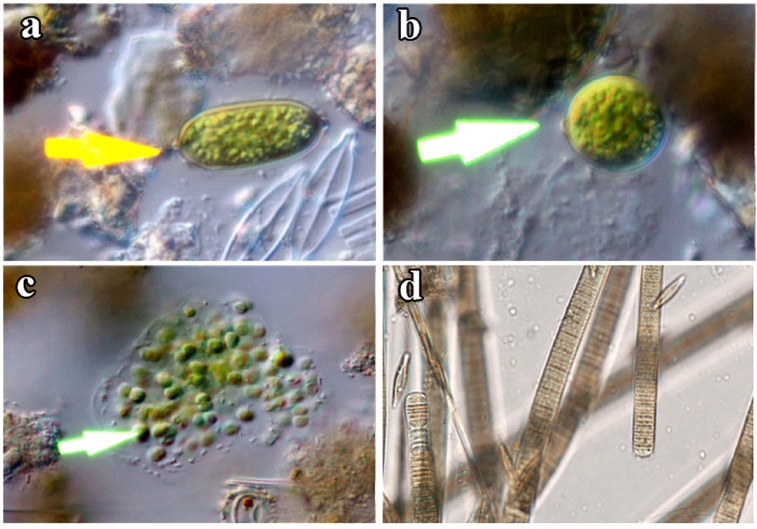 Observation of cyanobacteria akinetes (a, b), resting cell (c: Microcystis sp.) and benthic cyanobacteria (d: Oscillatoria sp.) in sediment.