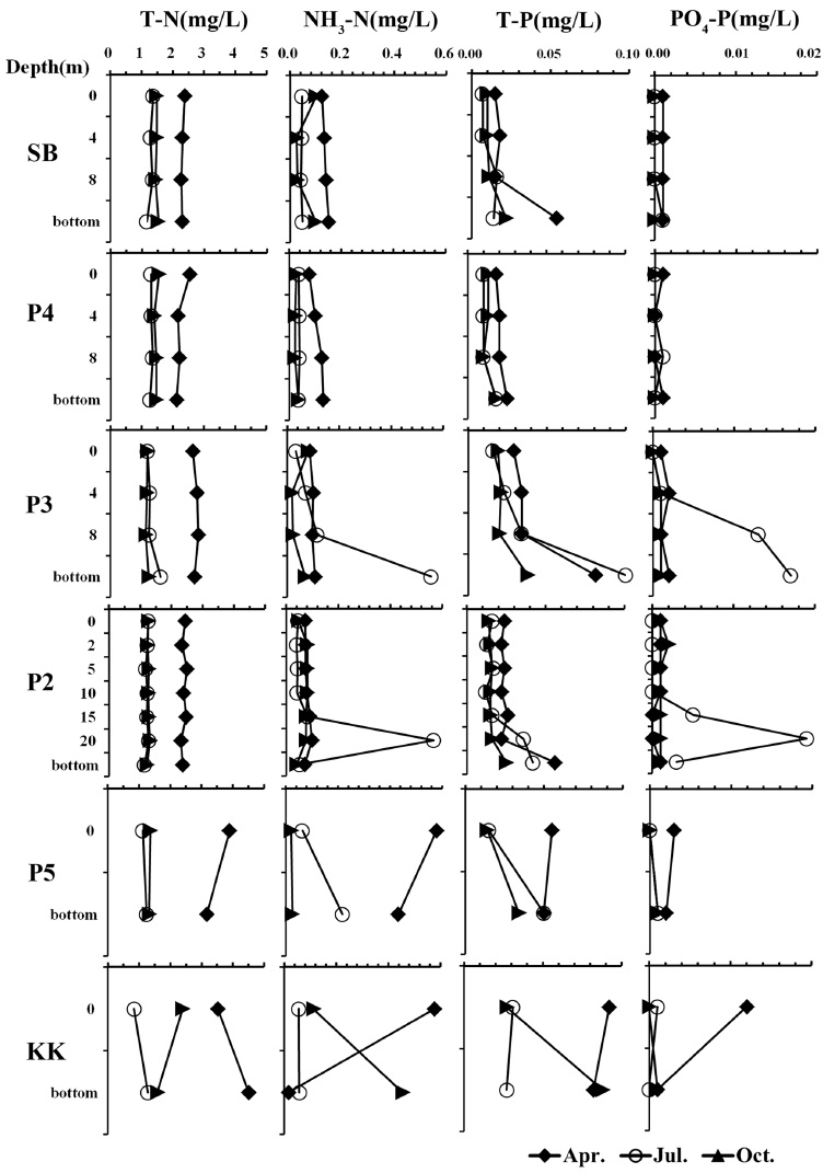 농도차이가 약 3배 차이를 나타냈다. PO4-P의 농도는 0∼0.019 mg/L의 범위로 대부분의 지점에서 0.002 mg/L 이하로 낮았으나, 4월의 KK 표층과 7월의 P3의 하층과 바닥층,