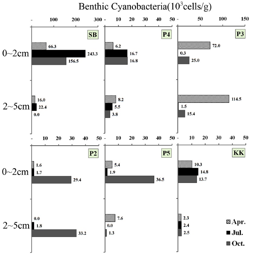 4월과 10월에 2∼5 cm에서 남조류의 현존량이 높았다. Kim et al. (2014)의 퇴적층배양 연구에서 저서성 남조류의 현존량이 3,000×103 cells/cm2 이상으로 증가하였을 때, 퇴적표층에 매트를 형성하고 수층으로 부상하였다. 본 연구에서는 남조류의 현존량이 배양실험의 결과보다 낮았으며, 각 조사