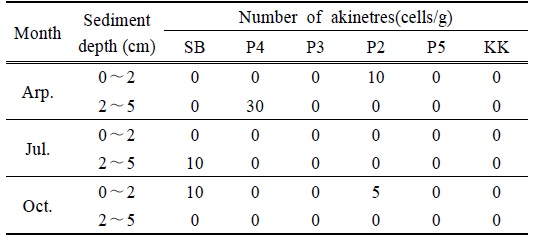 휴면포자(akinete)의 분석은 각 층별 퇴적층을 습중량 1 g(w/w)을 증류수에 분산시켰다. 분산은 초음파기(WUC-A03, Korean)로