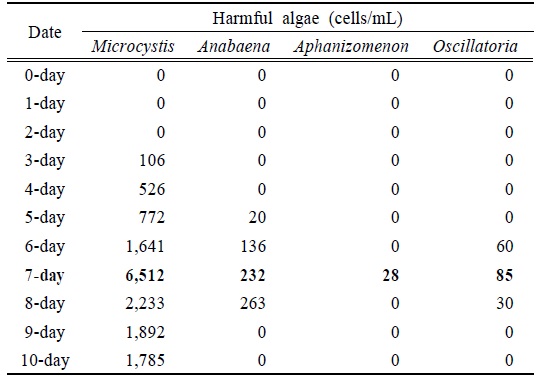 퇴적층 배양결과 배양 3일째 표층에서 Microcystis가 출현하였으며, 배양 7일까지 최대 6,512 cells/mL의 현존량으로 출현하였다. Anabaena는 배양 5일째 출현하여, 8일까지 지속적으로 증가하였고, 배양 9일 이후 출현하지 않았다. Oscillatoria는 배양 6∼8일째에 출현하였으며, Aphanizomenon은 배양 7일째에서만 출현하였다(Table 4). Anabaena의 경우 퇴적층 배양연구(Kim et al., 2014)에서 휴면포자 현존량이 2,200 cells/g(w/w)에서 배양 4일 후에 120 cells/g(w/w)로 감소한 후 배양 5일째 표층에서 Anabaena가 130∼752 cells/mL 범위로 7일간 출현한 것으로 연구되었으며, 이러한 결과에 따라 최적 환경조건에서 퇴적층을 배양 할 경우 배양 5∼8일에