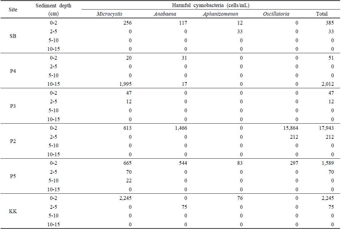 배양된 시료에서 표층수를 채집하여 분석하였다. 분석결과 유해남조류인 Oscllatoria (P2), Microcystis (전지점), Anabaena (P2, P4, P5, KK, SB), Aphanizomenon (P5, SB)이 출현하였으며, Oscllatoria의 경우 최대 15,846 cells/mL, Microcystis는 최대 2,245 cells/mL의 현존량을 나타냈다(Table 5). 퇴적깊이에 따른 분포는 대부분의 지점에서 퇴적깊이 5 cm 이상의 깊이에서는 남조류가 출현하지 않았으나, P4의 경우 퇴적층의 하층에 해당하는