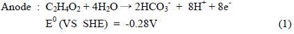 박테리아가 유기물을 분해하며 전자를 방출하고(식 (1)), 방출된 전자는 환원전극에서 (식 (2), (3))의 전기화학반응을 통해 수소 및 메탄을