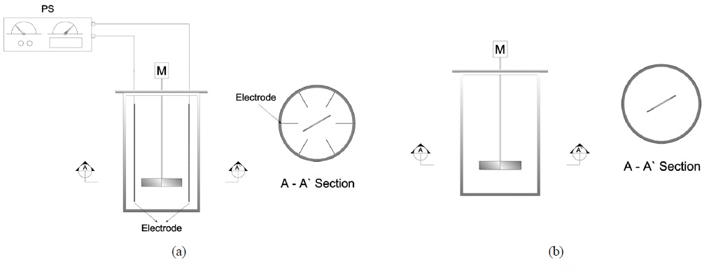 본 연구에서는 전압(0.3 V)을 공급하여 미생물 전기화학반응을 유도한 반응조(a)와 일반적인 혐기성소화를 위한 대조군 반응조(b)를 운영하였다.