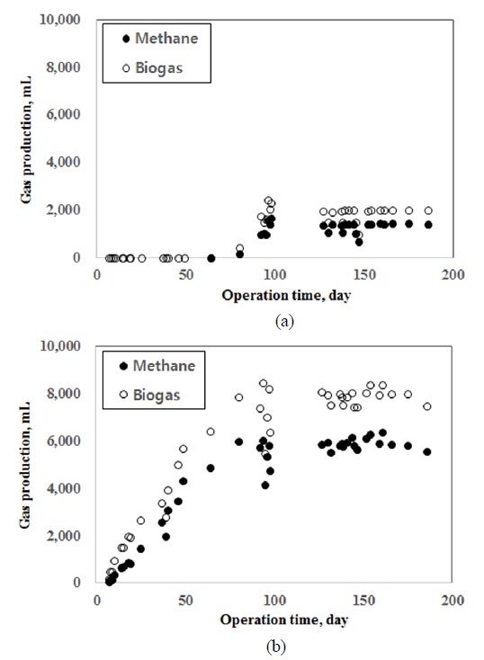 결합한 반응조의 경우 운전초기부터 바로 바이오가스 생산이 시작된 반면, AD의 경우 약 80일 경과 후 바이오가스 생산이 시작되었다. Lauwers et al. (1990)의 연구에 의하면 일반적인 AD의 경우 안정화기간이 2개월부터 9개월정도 소요된다고 보고되었으며, 본 연구에서는 약 3개월 소요되었다. MET-AD의