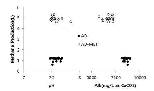 Methane production in AD and AD-MET accordance with the pH and Alk during steady state.