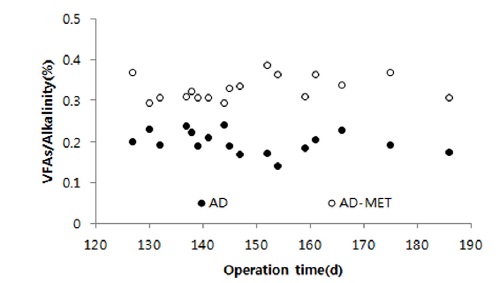 값이 0.4 이하일 때 충분한 완충력을 가진다고 보고되어 있다(Zhao and Kugel, 1996). 본 연구에서 안정화 기간AD와 AD-MET에서 r값이 각각 0.26, 0.32로 나타나 완충력이 충분하여 안정적으로 운전되고 있다고 보여진다(Fig. 5). 하지만 AD-MET에서 AD보다 알칼리도가 감소한 원인에 대해서는 추가적인 연구가 필요할 것으로 사료된다.