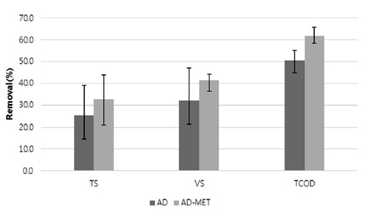 혐기성 반응조에서 안정화기간 유기물 제거효율은 Fig. 6과 같다. 안정화기간 TS, VS, TCOD 제거효율은 AD보다 AD-MET 반응조에서 각각 7.5, 9.1, 11.4% 높게 나타났다(Fig. 6). 일반적인 혐기성소화의 경우 TCOD 제거효율은 30∼35% 정도로 슬러지의 가수분해 속도를 향상시키는 전처리를 할 경우 제거효율이 5∼10%