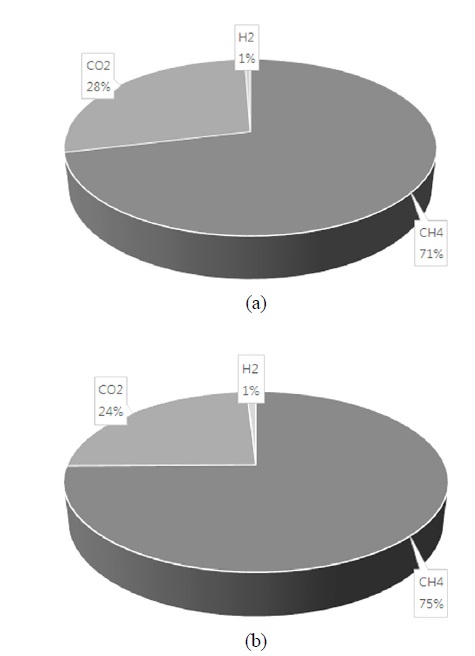 SCOD의 생성속도는 AD보다 각각 12%, 35% 향상된 반면, MET에서 메탄수율이 0.07L-CH4/g-CODre에서 0.25L-CH4/g-CODre로 증가한 원인을 알아보기 위해 가스성상을 분석하였다.