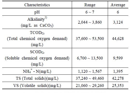 pH는 pH meter (Orion 420A+, Thermo orion, America)로 측정하였고, 기타 Alkalinity, TS, VS, T-N (Total-nitrogen) 등은 공정시험법을
