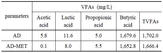 또한, 안정화기간 AD-MET에서 TVFAs와 SCOD의 생성속도는 AD보다 각각 12%, 35% 향상되었지만(Table 2), Table 4에서와 같이 반응조내 잔류 TVFAs의 농도는 AD와 AD-MET에서 1,702.0 mg/L와 1,666.4 mg/L로 비슷하였다(Table 3). 이는 AD-MET에서 TVFAs의 메탄 전환이 AD보다 크다는 것을 의미하며, Zhao et al. (2014)의 연구에서 MET 반응이 VFAs의 제어에 유리하며 메탄생성의 전환율을 높일 수 있다는 연구결과와 일치한다(Zhao et al., 2014). 결과적으로 VFAs의 메탄전환에 의해 Fig. 3에서 나타낸 메탄생성량의 차이가 발생했다고 사료된다.