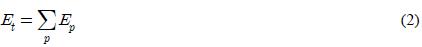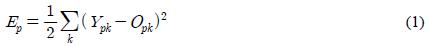 여기서, p는 다층퍼셉트론의 패턴번호, Ypk를 p번째 입력 패턴에 대한 k번째 처리소자의 실측값, Opk를 p번째 입력 패턴에 대한 출력층의 k번째 처리소자의 출력값, Ep는 p에 대한 오차, Et는 모든 패턴에 대한 총오차이다.