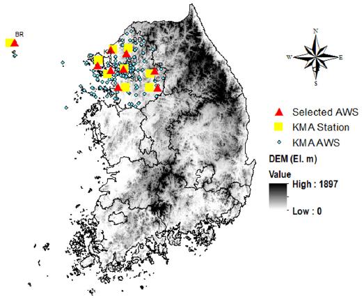 수도권 지역(서울, 인천, 경기)을 대상으로 기상관측소 지점 및 AWS 지점의 자료를 수집하였다. 수도권 내에는 2013년 12월을 기준으로 유인