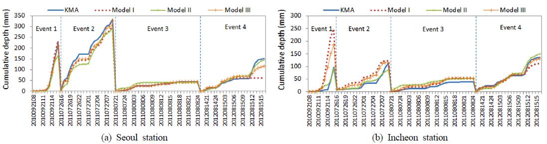 Fig. 2와 같다. 하지만 토석류 발생지점의 경우, 강우의 관측기록이 없는 미계측 지점이기 때문에 각 모형의 결과를 직접적으로 평가할 수 있는 방법이 부재하다.