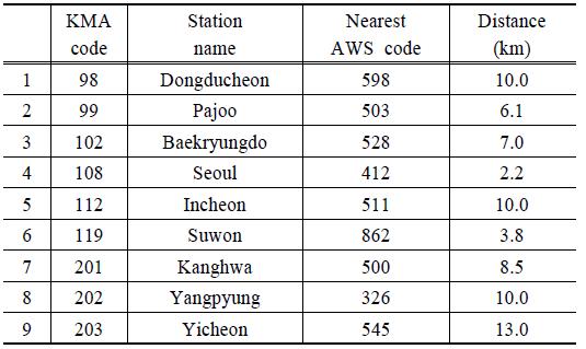 지점)하고 기상관측소와 가장 가까운 AWS 관측소를 ArcMap의 tools을 이용하여 추출하였으며 그 결과는 Table 1과 같다. 서울관측소(KMA code 108)의 경우 약 2.2 km의 직선 거리에 코드번호 412의 AWS가 위치하여 있으며, 이천관측소(KMA