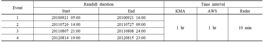 10분)를 선정하여 2010년부터 2012년 까지 주요 강우사상 4개에 대한 레이더 강우 자료도 수집(Fig. 4 참고)하였다. 따라서 Table 2와 같이 해당 이벤트기간에 대한 기상관측소(1시간 단위), AWS(1시간 단위), 레이더(10분 단위) 자료를 수집하였다. 여기에서 레이더 자료는
