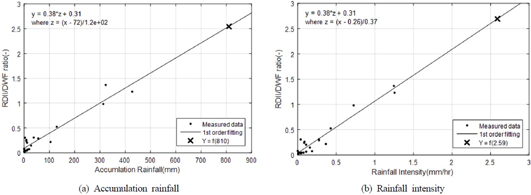 누적 강우량과 이벤트별 강우강도에 대해 회귀분석을 시행하여 RDII량을 모식할 수 있는 적합한 계수를 찾아내고자 하였다.