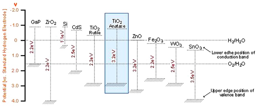 rutile이 더 적기 때문인 것으로 추정되고 있다. 실제 현재까지 밝혀진 TiO2의 광촉매 메커니즘에 따르면, 광촉매 TiO2가 재료의 고유한 band gab energy(Eg)보다 큰 energy를 받게 되면, 가전자대의 전자가 여기(excite)되어 전도대로 전이되고,