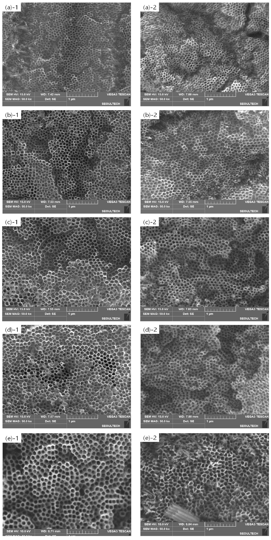 Fig. 5와 같이 TiO2 nanotube plate의 표면은 인가전압에 차이에 의해 변화는 미비한 것으로 나타났다. Fig. 6에서 나타나듯 인가전압이 높아질수록 TiO2 nanotube의 길이는 길어지는 것을 알 수 있었다. 이를 통해 인가전압이 높아질수록 TiO2 nanotube의 길이는 길어지는 것을 알 수 있는 데 이는 인가해주는 전압이 증가할수록 전기적 활성 에너지가 높아짐으로써 양극에서의 전자를 잃는