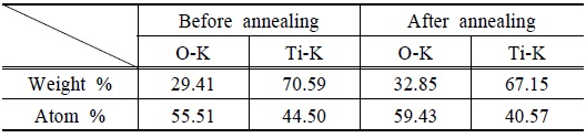 관찰결과 Table 2와 같이 annealing 과정 전과 후의 O원소의 정량은 감소하지 않는 것을 도출할 수 있었다. 따라서 TiO2 nanotube plate의 TiO2 nanoutbe는 annealing 과정시 anatase와 rutile상으로 결정구조가 변화 하지만 이로 인해 함유하고 있는 Ti와 O의 원소의