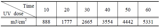 liquid chromatography를 이용하여 측정하였다. 70 V 이상의 인가전압으로 제작된 TiO2 nanotube plate에서 flaking 현상이 발견되어 30 - 60 V의 인가전압으로 제작된 TiO2 nanoutbe plate를 이용하여 효용성을 평가하였다. 효용성 평가 시 사용된 UV dose는 Table 3과 같다.