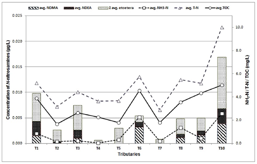 수중에서 검출되는 N-nitrosamines의 농도를 보면 지천 > 원수 > 정수 순으로 낮아졌으며, 오염도가 높은 지천이 한강 본류에 혼입되어 N-nitrosamines의 농도가 희석되고 이를 취수한 원수의 농도는 지천보다 낮게 된 것으로 사료된다.