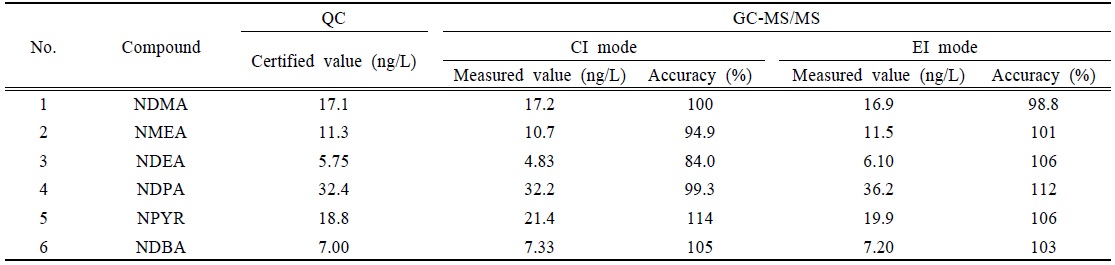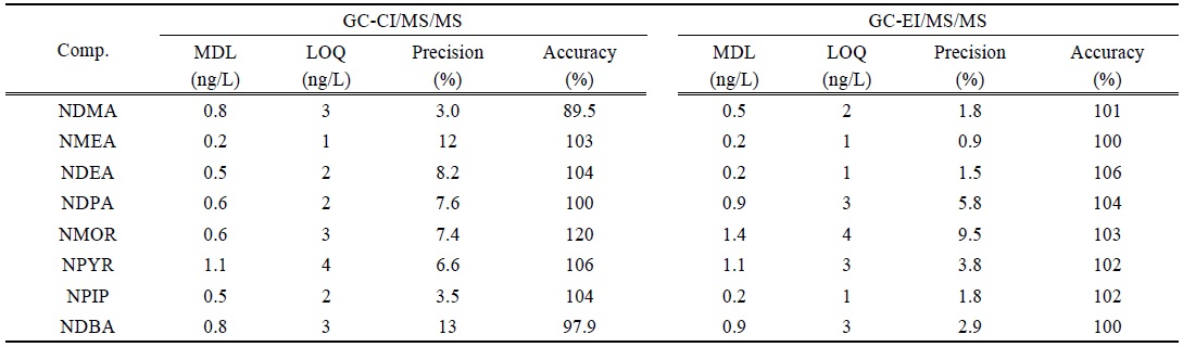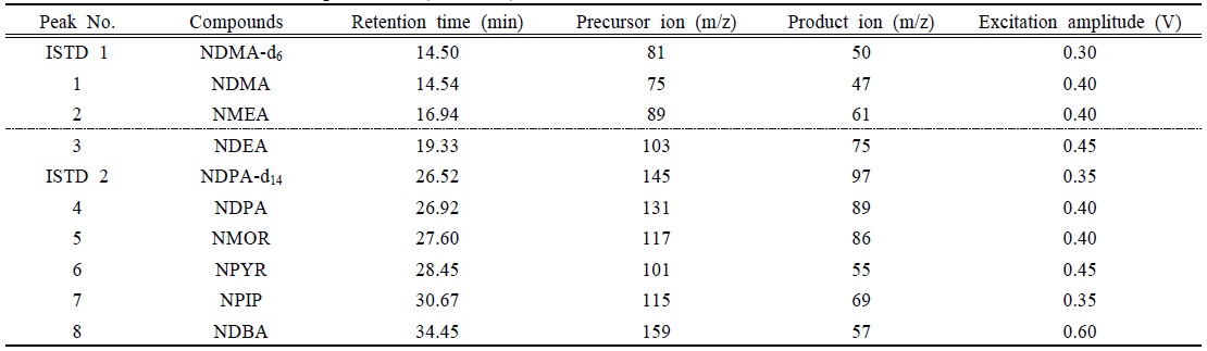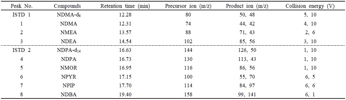 GC-EI/MS/MS의 경우 70 eV로 방출된 전자와 충돌에너지에 의해 조각난 생성이온(Product ion)을 선택하여 정량 하였으며, NDMA-d6를 사용하여 NDMA, NMEA, NDEA를 정량하였고, NDPA-d14로 NDPA, NMOR, NPYR, NPIP, NDBA를 정량하였다(Table 4).