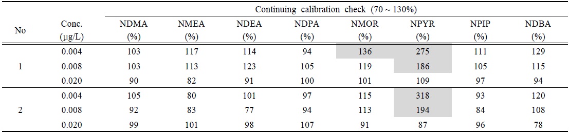 NDMA-d6는 0.020 μg/L, NDPA-d14는 0.040 μg/L 농도가 되도록 주입한 후 시료와 동일한 방법으로 전처리하였다.