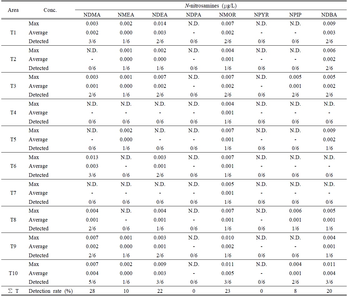 NDMA가 최대 0.008 μg/L, 그 외 NMOR과 NPYR이 검출되었다고 보고하였다. 국내의 경우 Kim et al. (2010), Kim et al. (2014)의 연구에 따르면 부산시 소재 2개 정수장에서 취수원수와 정수에 대해 조사한 결과 N-nitrosamines이 모두 불검출되었으며, 낙동강 본류 10개 지점에서는 N-nitrosamines 9종의 합이 최대 0.223 μg/L 검출되었다고 보고하였다.