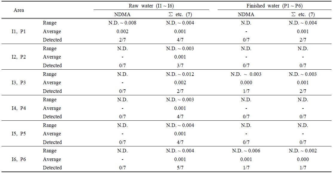 연구한 Luo et al. (2012)의 결과에 따르면 원수에서 NDMA가 최대 0.022 μg/L 검출되었고 그 외 NDEA, NMOR, NPYR, NPIP가 검출되었으며, 정수에서는