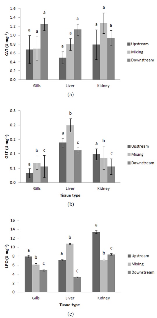 peroxidation (LPO) in the gills, liver, and kidneys of Carassius auratus collected at upstream, mixing, and downstream sites of the Eungcheon stream. Data
