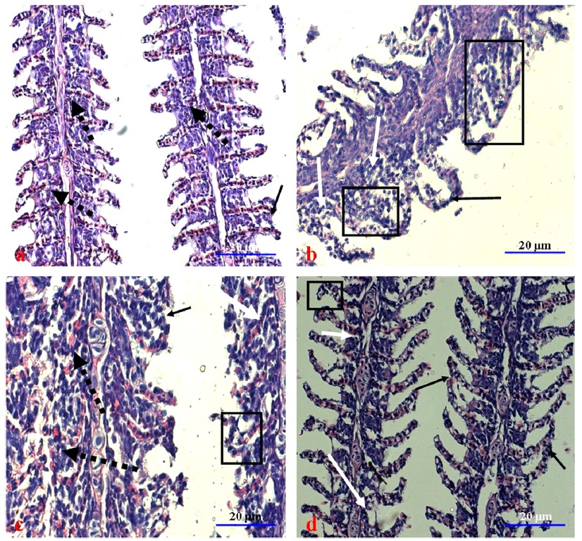 showing curling of SGL (square), fusion (black arrow) and damage of chloride cells