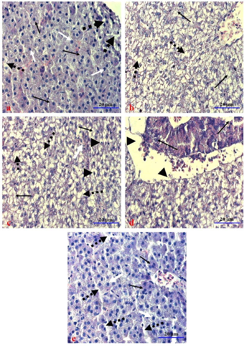 cytoplasmic vacuolation, as observed in the present study, were also reported by Figueiredo-Fernandes et al. (2007) in Oreochromis niloticus and by Mario et al. (2011) in the liver of both Carassius auratus and Dicentrarchus labrax. Vacuolization, as observed in hepatocytes, indicates an imbalance between the rate
