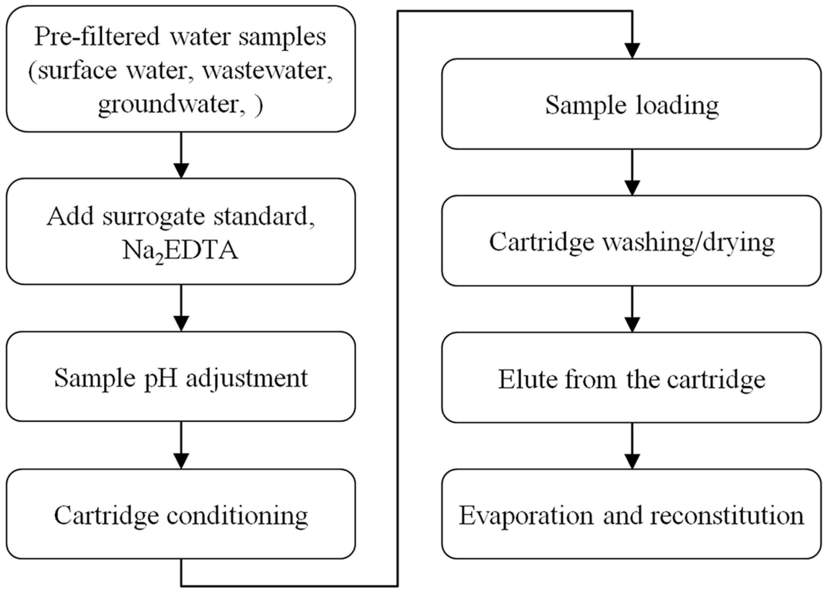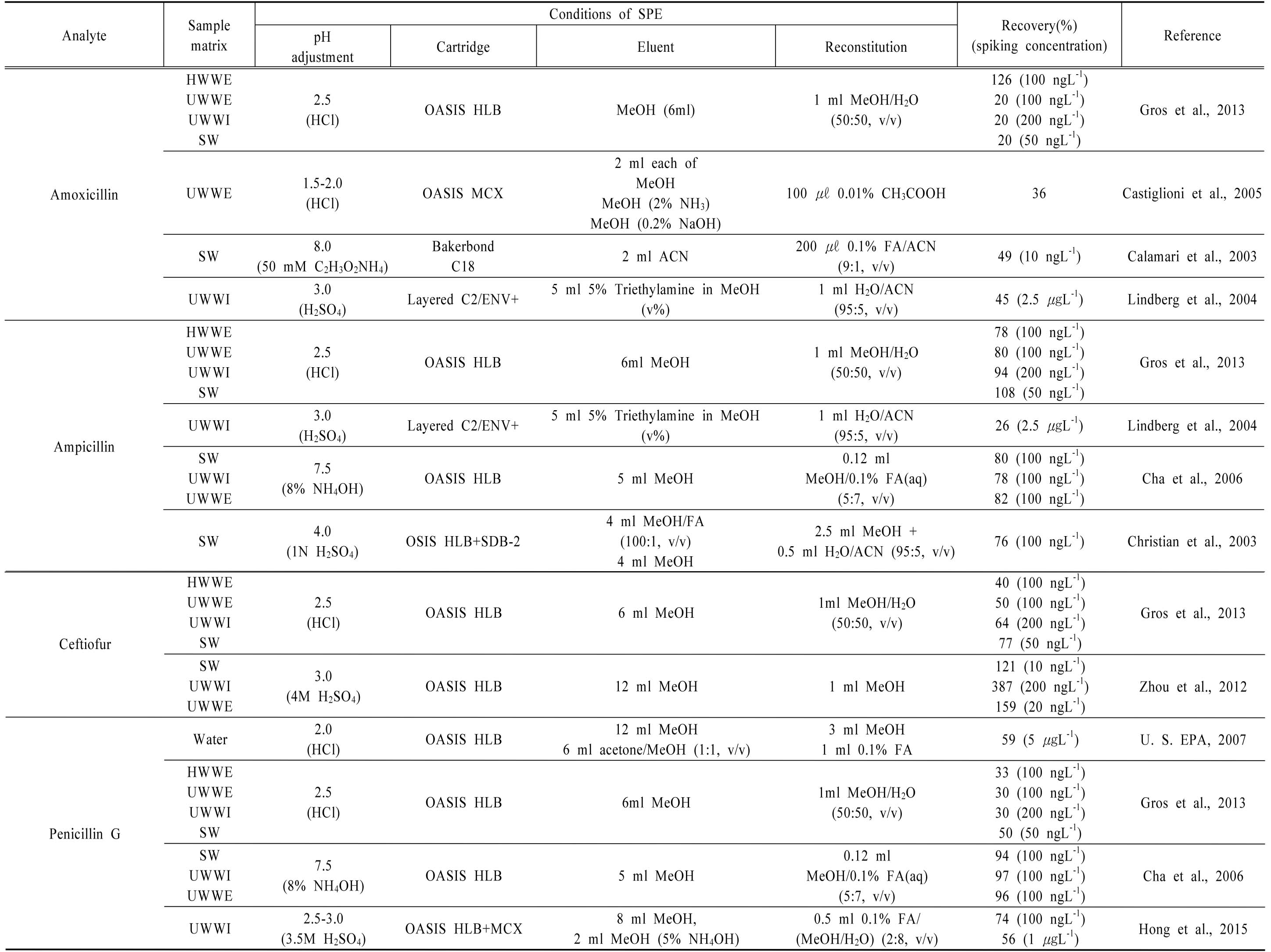 고상추출법은 일반적으로 Fig. 1과 같이 컨디셔닝(conditioning)- 시료적재-세척-추출-농축의 단계를 거친다. 고 상추출 대상 시료는 전여과(pre-filtration)하여 입자물질을 제거하고 대용표준물질(surrogate standard), EDTA(ethylenediaminetetraacetic acid)를 투입하거나 pH를 조절하며 농축 시료를 후여과(post-filtration)하기도 한다. EDTA는 시료 중 의 금속이온을 착물의 형태로 제거하기 위하여 투입하며(De Alwis and Heller, 2010; Gros et al., 2013) 추출법의 효율 을 평가하기 위해 추출 과정이 시작되기 전, 대용표준물질을 시료에 투입하기도 한다. 시료의 pH, 카트리지의 종류, 추출 (extraction)과 농축(concentration)에 사용되는 유기용매 및 사용량은 분석대상 물질에 화학적 특성에 따라 상이하며 보 편적으로 적용 가능한 최적 전처리조건을 도출하기 위한 다 양한 연구가 진행되어 왔다(Ben et al., 2008; De Alwis and Heller, 2010; Gros et al., 2013; Iglesias et al., 2012; Zhou et al., 2012). 물 시료는 자연에 존재하는 지표수(surface water, SW)와 지하수(ground water, GW), 병원과 돼지 사육 농장의 폐수처리장 유출수(hospital wastewater effluent, HWWE; swine wastewater, SWW), 도시하수처리장의 유입·유출수 (urban wastewater influent, UWWI; urban wastewater effluent, UWWE)를 대상으로 하였고, Table 3~5에 물 시료 중 잔류 항생제 농도 분석을 위한 전처리 방법을 정리하였다.